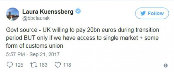 "Marea Britanie doreste sa plateasca 20 de miliarde de euro in perioada de tranzitie, dar numai daca avem acces la o piata unica si la o uniune vamala", a scris Laura Kuenssberg pe Twitter.