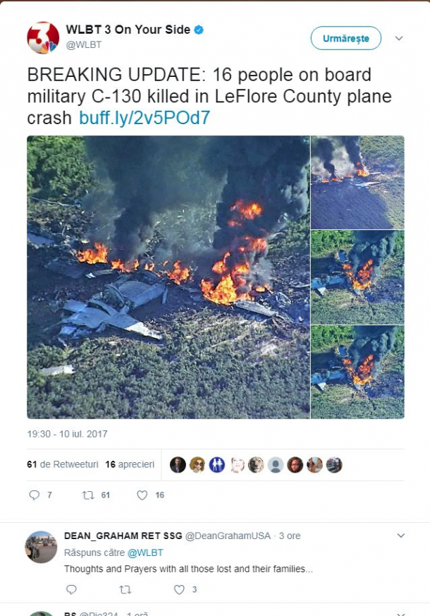 Tragedie în Mississippi, SUA! Un avion care aparținea marinei militare s-a prăbușit marți pe un câmp din soia. Oamenii aflați la bord, 16 persoane au murit, informează oficialii americani, relatează site-ul agenției The Associated Press, potrivit mediafax.ro.