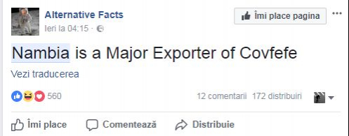 "Nambia, principalul producător mondial de covfefe", a scris @bellafortunate, referindu-se la un tweet eronat al lui Donald Trump din luna mai, relatează agerpres.