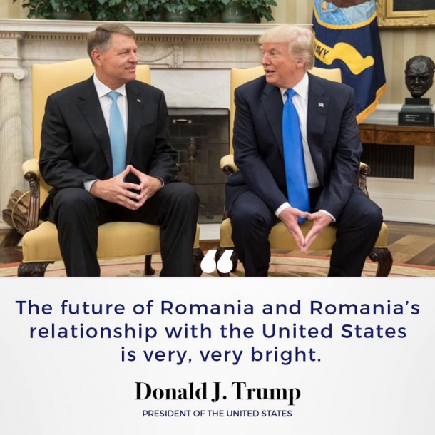 Preşedintele SUA Donald Trump a postat pe Facebook o imagine de la întâlnirea cu preşedintele Klaus Iohanni, spunând că a avut marea onoare de a-l primi pe acesta la Casa Albă. Imaginea este însoţită de declaraţia din timpul conferinţei de presă comune, conform căreia viitorul României şi al relaţiei dintre cele două ţări este "foarte, foarte luminos".