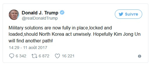 "Opțiunile militare sunt acum puse la punct, în cazul în care Coreea de Nord va acționa fără discernământ. Sper însă că Kim Jong Un va găsi o altă cale!", a scris Trump.