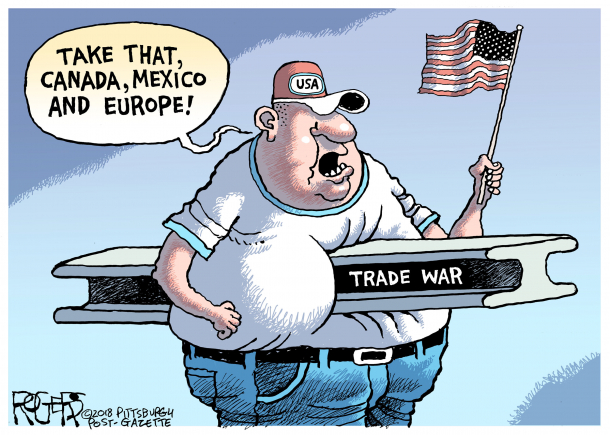 În ultima caricatură care i-a fost publicată, un bărbat umflat care reprezintă SUA, străpuns de o ţeapă din oţel pe care scrie “război comercial”, flutură steagul american şi spune: “Asta este pentru voi, Canada, Mexic şi Europa!”.