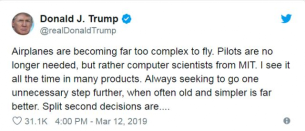 ”Avioanele au devenit mult prea complexe pentru a zbura. Piloții nu mai sunt necesari, cât IT-știi de la MIT ( Massachusetts Institute of Technology-n.red). Văd asta tot mai mult, la mai multe produse. Mereu se încearcă să se facă un pas inutil înainte, când vechile metode, mai simple, sunt de departe mai bune. (…) Complexitatea creează pericol, și toate astea la costuri mari și cu niște câștiguri mici. Nu știu voi ce credeți, dar eu unul nu aș vrea ca Albert Einstein să îmi fie pilot. Vreau piloți profesioniști cărora să li se permită să ia repede și ușor controlul asupra avionului”, a scris pe Twitter președintele american.