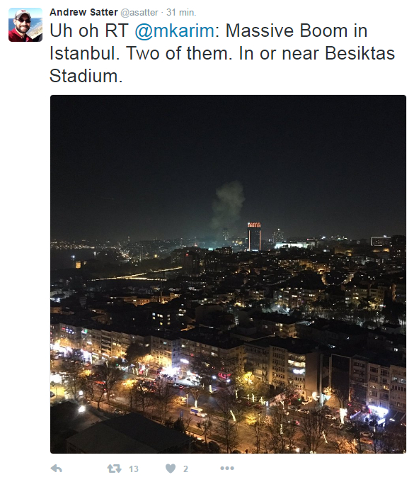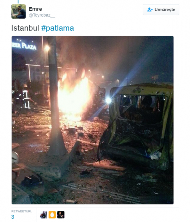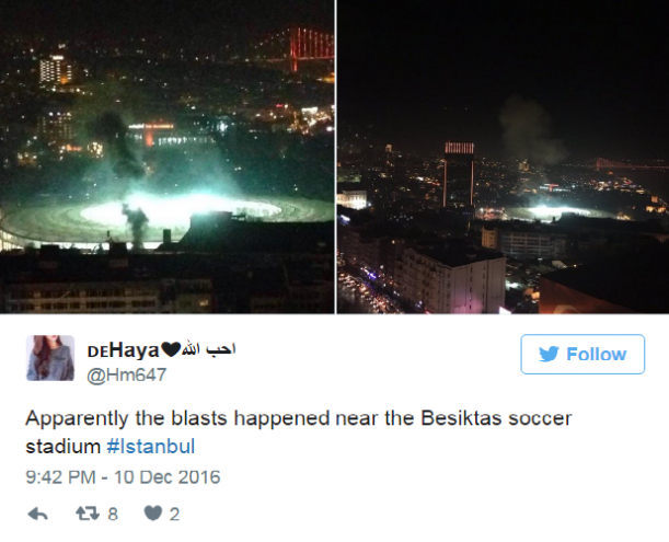 Potrivit ministrului, o mașină capcană a explodat aproape de o dubă a unuiechipaj al poliției, aflată lângă stadionul în care cu o oră în urmă avusese loc un meci între echipele de fotbalBeșiktaș și Bursaspor.