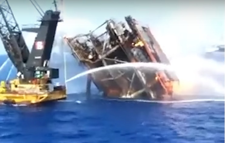Imagini filmate aparent de pe o navă de salvare rusă aflată în zonă au arătat că platforma BK-1 este acum înclinată pe o parte, iar pompierii încearcă să oprească incendiul.