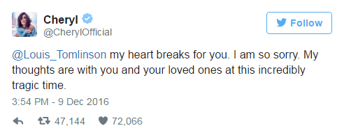 "Mi se frânge inima când mă gândesc prin ce treci. Îmi pare atât de rău. Gândurile mele se îndreaptă către tine şi către cei dragi ţie în acest moment tragic.", a scris Cheryl Cole pe contul său de Twitter.