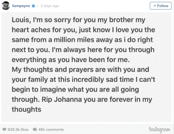 "Louis, îmi pare atât de rău pentru tine, frate. Voi fi mereu aici pentru tine, aşa cum ai fost şi tu lângă mine de fiecare dată. Gândurile şi rugăciunile mele sunt cu tine şi cu familia ta în aceste momente incredibil de triste. Nici nu-mi pot imagina prin ce treceţi acum. Odihneşte-te în pace, Johanna. Vei fi mereu în gândurile mele.", a scris Liam Payne, unul dintre membrii trupei pe contul de Instagram.