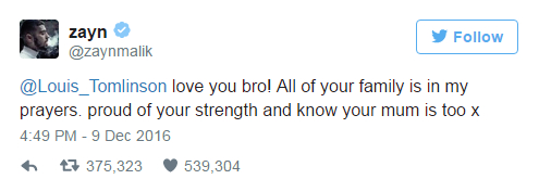 "Te iubesc, frate! Toată familia ta face parte din rugăciunile mele. Îţi admir puterea şi cred că şi mama ta face acelaşi lucru.", au fost cuvintele luiZayn Malik.