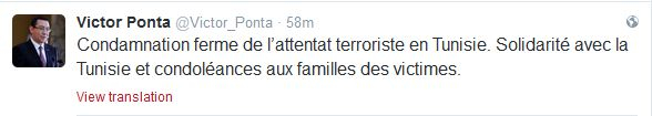 „Condamn cu fermitate atentatul terorist din Tunisia. Solidaritate cu Tunisia și condoleanțe familiilor victimelor”, a transmis Victro Ponta vineri pe Twitter, în limba franceză.