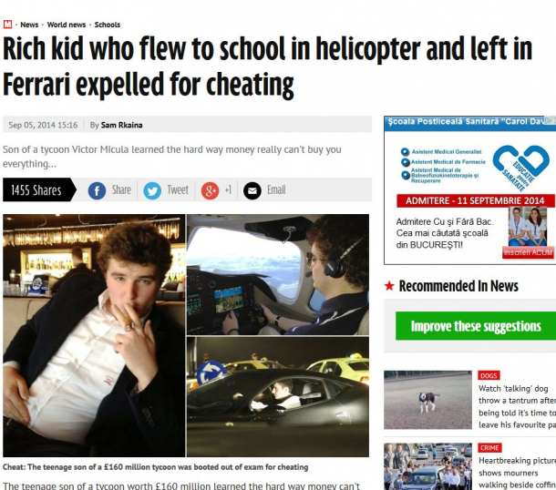 „Fiul magnatului Victor Micula a simţit pe pielea sa că banii nu pot cumpăra chiar totul. Fiul adolescent al omului de afaceri a cărui avere se ridică la 160 de milioane de lire sterline a înţeles acest lucru când a fost dat afară din examenul de bacalaureat, după ce a încercat să copieze”, scriu jurnaliştii de la The Mirror.