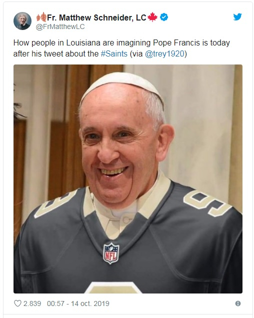New Orleans Saints are 1,5 milioane de urmăritori pe Twitter, în timp ce contul Papei Francisc în limba engleză, 1,8 milioane, astfel că postarea Sfântului Scaun a devenit virală. Mii de fani ai fotbalului american au reacţionat amuzaţi, mulţumind pentru binecuvântarea primită.