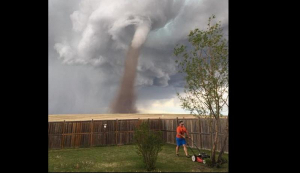 O fotografie care prezintă un bărbat care tunde iarba, în timp ce în spatele lui o tornadă amenințătoare se apropie, a devenit virală pe rețelele de socializare. Bărbatul din Canada știa că se aproprie tornada, dar „nu era deloc îngrijorat” , spune soția acestuia, cea care a făcut poza,potrivitBBC.