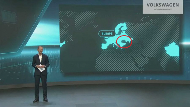 Reprezentanții celor de la Volkswagen au prezentat o hartă care a lăsat România în afara continentului, o pată neagră, la fel ca Marea Neagră. Cei de la site-ul Insideevs.com a remarcat greșeala din prezentarea făcută de Volkswagenla Power Day.