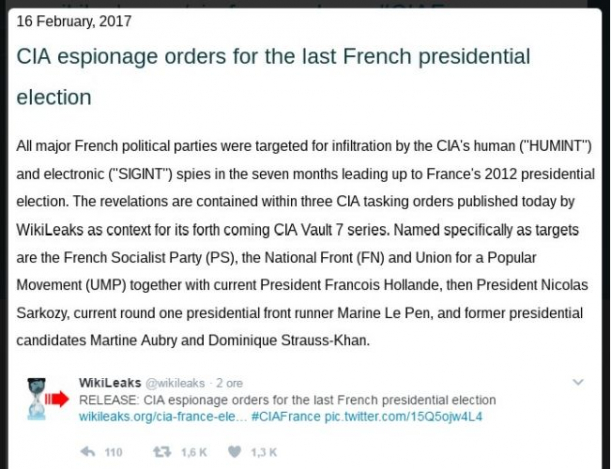 Wikileaks a desecretizat trei ordine secrete de spionaj ale CIA care relevă detaliile urmăririi de-a lungul a zece luni a alegerilor prezidențiale din Franța, din 2012. Documentele dezvăluite arată că toate marile tabere politice implicate au fost infiltrate cu oameni ai CIA ("HUMINT")și spioni electronici ("SIGINT").