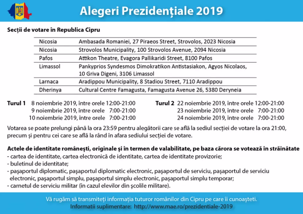 DIASPORA VOT / CIPRU Secţii de votare / ALEGERI PREZIDENŢIALE 2019. Unde votează românii din Dispora în CIPRU