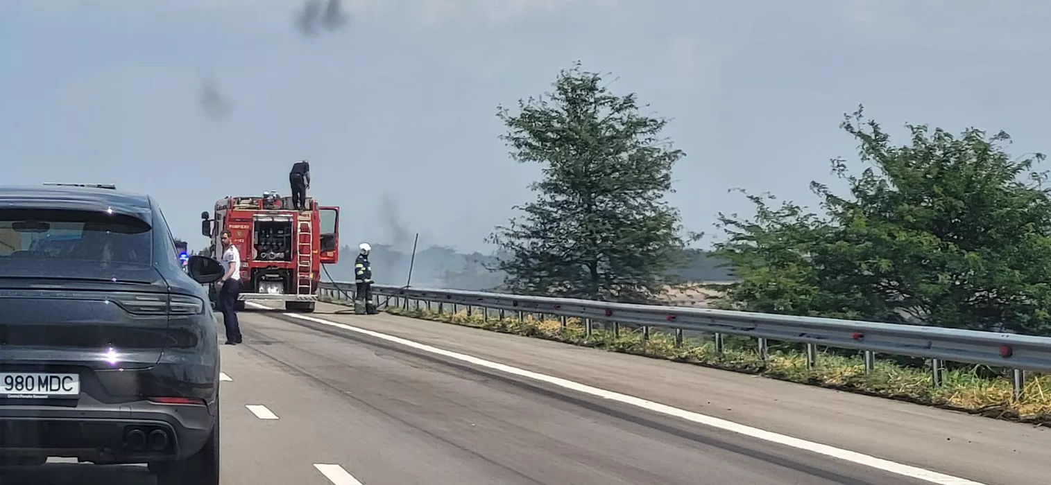 Exclusiv // Incendiu violent pe Autostrada Soarelui: O autoizotermă a luat foc. Flăcările au cuprins și un lan de grâu (GALERIE FOTO)