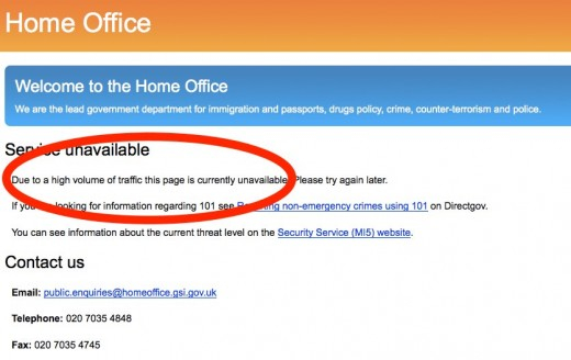 Site-ul Home Office a fost blocat o bună perioadă de timp pe 8 aprilie, în ziua atacului Anonymous de tip DDOS (Distributed Denial of Service), care a inundat serverele site-ului britanic cu un trafic extrem.
