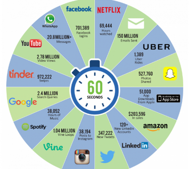 S-a mai constatat ca , într-un minut se trimit 15,000 de gif-uri pe Facebook Messenger, apar 120 de conturi noi pe Linkedin, se ascultă 40,000 de ore de conţinut audio pe Spotify, se trimit aproape o jumătate de milion de tweet-uri, se descarcă peste 340,000 de aplicaţii (iOS şi Android), se urmăresc 4,1 milioane de clipuri pe YouTube sau se trimit 16 milioane de mesaje.