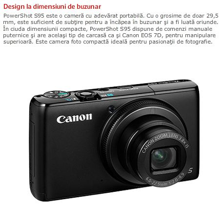 Canon S95 este evoluția modelului S90, foarte bine primit de fotografii profesioniști. Este micuț cu lentile wide și oferă majoritatea funcțiilor manuale pentru fotografiat. Dar, spre desoebire de precedenta generație, acest Canon poate filma HD 720p, are o funcție de stabilizare a imaginii îmbunătățită și design-ul un pic schimbat. Performanțele sale sunt însă catalogate ca acceptabile.