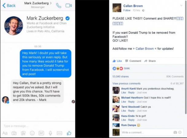 Mai exact, se pare că un utilizator de Facebook din marea Britanie, Callan Brown, i-ar fi scris lui Mark Zuckerberg cu scopul de a-l întreba de câte like-uri, share-uri și comentarii are nevoie postarea sa pentru ca pagina de Facebook a miliardarului american să fie ștearsă.