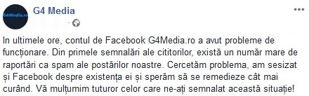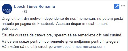 Mai multe conturi de Facebook din România, fie ale unor publicații, fie ale unor persoane, se plâng joi după-amiază de faptul că nu mai pot posta nimic pe rețeaua de socializare, iar unele dintre postări sunt șterse. Este vorba în special de postări prin care se distribuie opinii sau articole despre violențele jandarmilor de la mitingul diasporei, sau pur și simplu postări critice la adresa guvernării PSD.