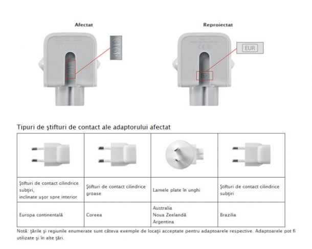Compania Apple recheamă adaptoarele de priză cu două ştifturi de contact, proiectate pentru a fi utilizate în Europa continentală, Australia, Noua Zeelandă, Coreea, Argentina şi Brazilia. Potrivit specialiștilor companiei americane, acestea prezintă risc de rupere și ar putea provoca electrocutarea.