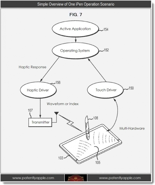 Apple a depus recent documentarea necesară pentru obținerea unui brevet de stilou destinat dispozitivelor cu touchscreen. ”iPen” poate oferi răspuns haptic (tactil), vizual și audio (va avea și microfon), în funcție de intensitatea interacțiunii cu ecranul.