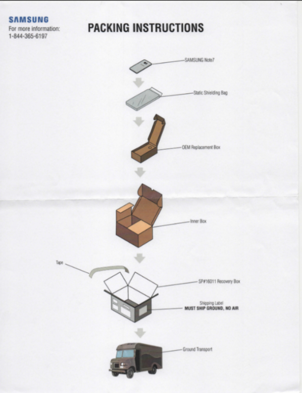 Pentru a-și rezolva problemele până la capăt, compania a anunțat utilizatorii că trebuie să înapoieze telefoanele în Coreea de Sud pentru a evita astfel riscul altor explozii. Însă pentru a face ca transportul să fie cât mai sigur, Samsung trimite posesorilor de Note 7 un kit de returnare, potrivit HotNews.ro.