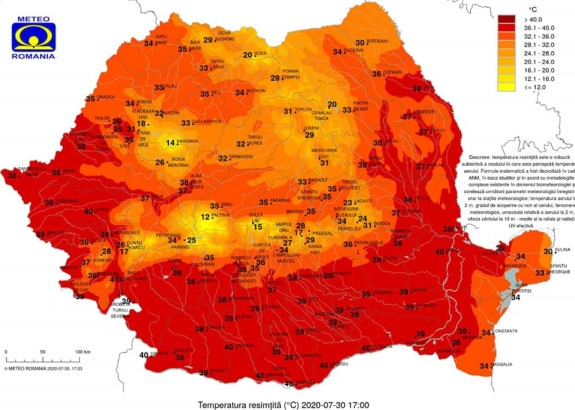 Indicele temperatura-umezeala a atins si depasit azi pragul critic de 80 unitati in vest, sud, sud-est si est, unde si temperatura resimtita a avut valori de 40 – 44 de grade Celsius.