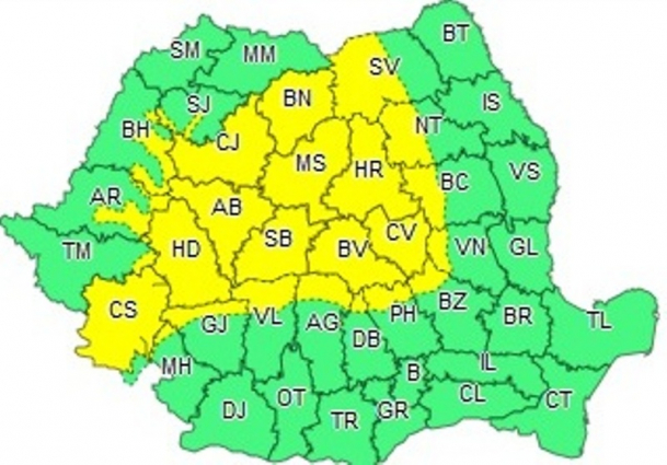 Administrația Națională de Meteorologie a emis un cod galben de vreme rea, valabil luni, până la ora 23.00, în mai multe județe din centrul țării.