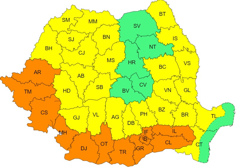 Administrația Națională de Meteorologie a emis noi avertizări de caniculă, coduri galbene și portocalii, care sunt valabile pentru duminică și marți, afectând majoritatea teritoriului țării, cu excepția unor județe montane și a zonei litorale.