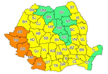 Meteorologii ANM au emis mai multe coduri galbene și portocalii pentru caniculă, dar și un cod galben de instabilitate atmosferică accentuată, mai exact vijelii și furtuni, dar și grindină.