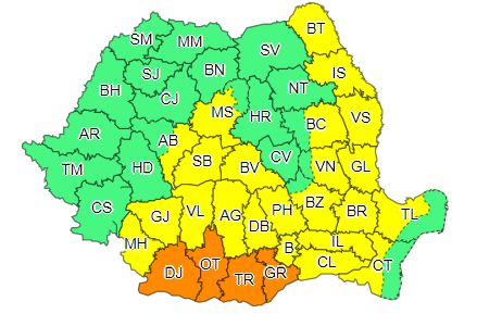 Cod portocaliu de caniculă: În județele Dolj, Olt, Teleorman și Giurgiu temperaturile maxime se vor situa între 38 şi 40 de grade. Disconfortul termic se va menține deosebit de accentuat, iar indicele temperatură-umezeală (ITU) va depăși pragul critic de 80 de unități.