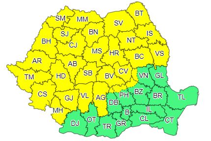 Cod galben de caniculă: Valul de căldură va persista în sudul, centrul și estul țării, disconfortul termic va fi în continuare accentuat, iar indicele temperatură-umezeală (ITU) va depăși pe arii extinse pragul critic de 80 de unități. Va fi caniculă în Oltenia, Muntenia, local în Moldova, vestul Dobrogei și sudul Transilvaniei. Temperaturile maxime vor fi cuprinse frecvent între 34 și 37 de grade.