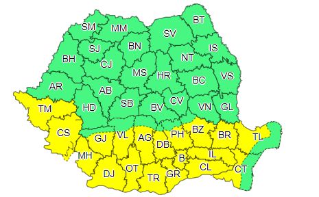 Codul galben de caniculă vizează județele: Timiș, Caraș – Severin, Mehedinți, Gorj, Dolj, Vâlcea, Olt, Argeș, Teleorman, Dâmbovița, Giurgiu, Prahova, Buzău, Călărași, Ialomița, Brăila, Tulcea și Constanța, dar și Municipiul București.