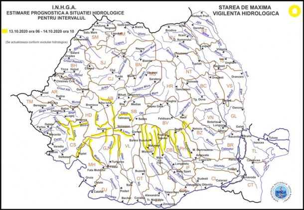 „Atenţionarea vizează în principal fenomenele de scurgeri importante pe versanţi, torenţi, pâraie, viituri rapide pe râurile mici cu posibile efecte de inundaţii locale, care se pot produce cu probabilitate și intensitate mai mare în intervalul 13.10.2020 ora 11:00 – 13.10.2020 ora 18:00 pe unele râuri mici din judeţele: Caraş Severin, Gorj, Dâmboviţa şi Prahova”, mai transmis hidrologii.