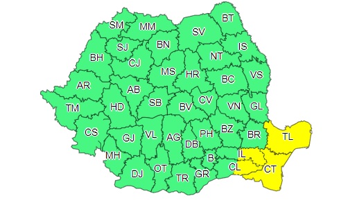 Administrația Națională de Meteorologie a emis o avertizare de tip Cod galben de ploi însemnate cantitativ și intensificări ale vântului pentru Dobrogea și sud-estul Munteniei.
