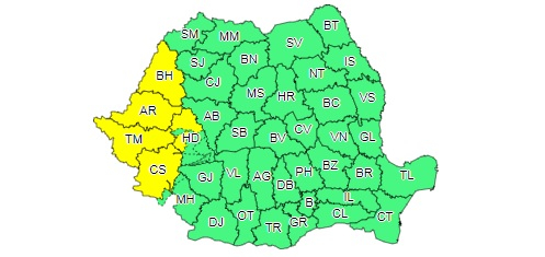 Administrația Națională de Meteorologie (ANM) a emis, miercuri, o atenționare cod galben, de insabilitate atmosferică, valabilă în intervalul 5 august, ora 15.00 – 6 august, ora 2.00. Vizate sunt județele Bihor, Arad, Hunedoara, Timiș și Caraș-Severin.