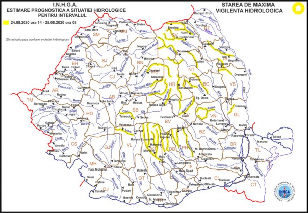 Potrivit INHGA, atenţionarea hidrologică vizează în principal fenomenele de scurgeri importante pe versanţi, torenţi, pâraie, viituri rapide pe râurile mici cu posibile efecte de inundaţii locale, care se pot produce cu probabilitate și intensitate mai mare în intervalul 24.08.2020 ora 16:00 – 24.08.2020 ora 22:00 pe unele râuri mici din judeţele:Neamţ, Bacău, Harghita, Covasna, Iaşi şi Vaslui.
