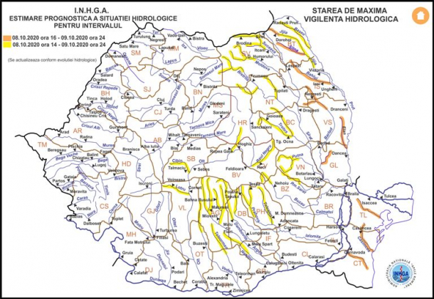 Astfel, o avetizare cod portocaliu a fost emisă pentru intervalul 08.10.2020 ora 16:00 – 09.10.2020 ora 10:00pe râurile din bazinele hidrografice: Bârlad – bazin superior şi afluenţi bazin mijlociu şi inferior(judeţele: Iaşi, Vaslui, Bacău, Neamţ, Vrancea şi Galaţi),Siret – afluenţii mici aferenţi sectorului aval S.H. Huţani(judeţele: Suceava, Neamţ, Iaşi, Bacău, Vrancea şi Galaţi),Jijia – bazin superior şi afluenţi bazin mijlociu şi inferior(judeţele: Botoşani şi Iaşi),Prut – afluenţii mici aferenţi sectorului aval Ac. Stânca Costeşti(judeţele: Botoşani, Iaşi, Vaslui şi Galaţi).