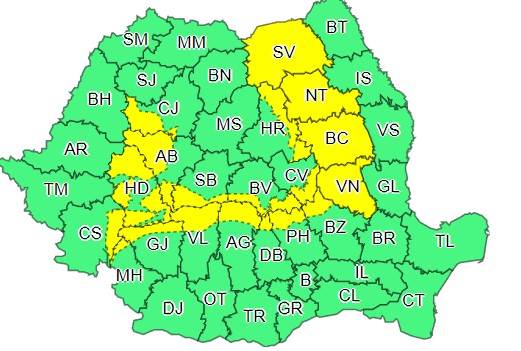 De asemenea, în același interval, orar, alerta se menține și în jumătatea vestică a Moldovei, local în Carpații Orientali și Occidentali.