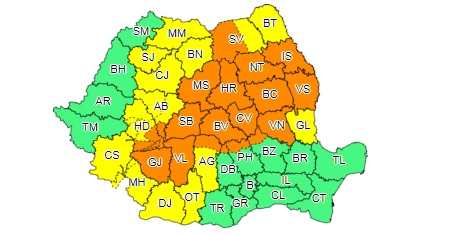 Meteorologii au emis, luni, o avertizare cod portocaliu de vreme rea, valabilă pentru 19 județe din nordul, estul și centrul țării. În același timp, alte 14 județe sunt vizate de o avertizare cod galben de instabilitate atmosferică temporar accentuată.