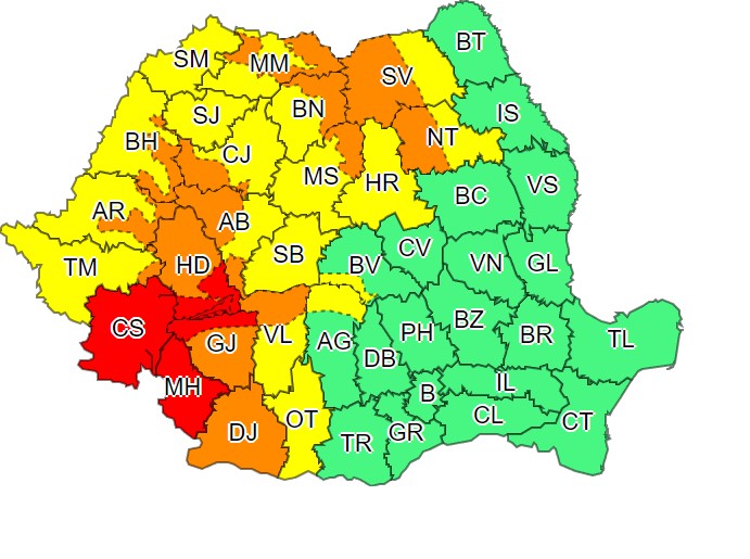 Alerta de cod roșu este valabilă în județele Mehedinți, Caraș-Severin și zona de munte a județelor Gorj și Hunedoara, până la ora 12.00. Vor fi averse torențiale și abundente. În intervale scurte de timp și prin acumulare cantitățile de apă vor fi de 50…70 l/mp și izolat vor depăși 80 l/mp.