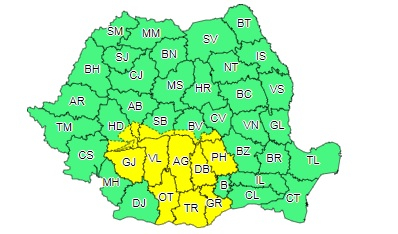Astfel, potrivit Administrației Naționale de Meteorologie, de miercuri, de la ora 14.00, până joi la ora 6.00, local în Oltenia și Muntenia, precum și în zona Carpaților Meridionali și a Carpaților de Curbură, vor fi perioade cu instabilitate atmosferică accentuată ce se va manifesta prin frecvente descărcări electrice, vijelii, grindină și averse ce vor avea și caracter torențial. Cantitățile de apă vor depăși 25…35 l/mp și pe arii restrânse 40 l/mp.
