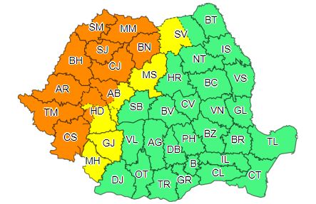 „ În județele Satu-Mare, Maramureș, Bistrița-Năsăud, Sălaj, Cluj, Bihor, Arad, Timiș și Caraș-Severin, precum și în zona de munte a județelor Alba și Hunedoara, vor fi perioade cu instabilitate atmosferică deosebit de accentuată. Vor fi averse torențiale, vijelii, grindină și frecvente descărcări electrice. Cantitățile de apă vor depăși local 35…50 l/mp și pe arii restrânse 60…80 l/mp”, anunță meteorologii ANM.