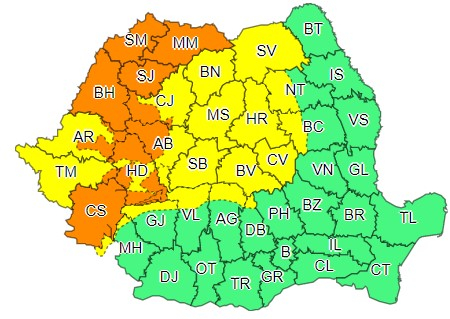 Codul portocaliu este valabil în Maramureș, nord-vestul Transilvaniei, nordul Crișanei, precum și în zona Carpaților Occidentali și în vestul Carpaților Meridionali, undeva ploua temporar abundent, iarprin acumulare, cantitățile de apă vor depăși 40-70 l/mp.