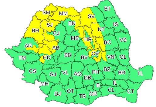 Județele pe care meteorologii le-au plasat sub cod galben de vânt sunt: Alba, Maramureș, Satu Mare, Sălaj, Bihor, Hunedoara, Arad, Cluj, Bistrița-Năsăud, Suceava, Neamț, Bacău, Vrancea, Covasna, Harghita și Mureș, potrivit hărții ANM.