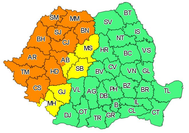 În județele Timiș, Arad, Bihor, Sălaj, Satu Mare, Maramureș, Bistrița Năsăud, Cluj, Hunedoara, Caraș-Severin, precum și în zona montană a județului Alba vor fi perioade cu instabilitate atmosferică deosebit de accentuată. Vor fi vijelii puternice, intensificări ale vântului cu rafale de peste 80…90 km/h, grindină și frecvente descărcări electrice. Vor fi averse torențiale, iar cantitățile de apă vor depăși local 35…50 l/mp și izolat 70…80 l/mp, anunță meteorologii ANM.