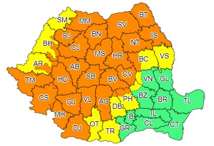 Institutul Naţional de Hidrologie şi Gospodărire a Apelor a emis o avertizare de tip cod portocaliu de inundații, valabil pe râurile din următoarele bazine hidrografice: