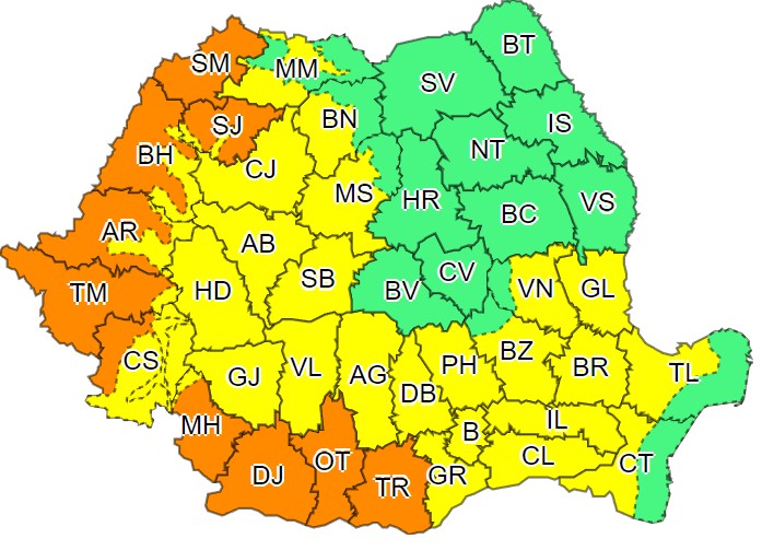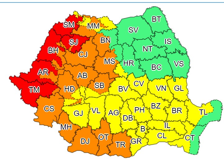 UPDATE: Meteorologii au emis un cod roșu de caniculă în vestul țării. În județele Timiș, Arad, Bihor, Satu Mare și Sălaj se vor înregistra temperaturi maxime extreme, comparabile cu recordurile absolute. Acestea vor fi cuprinse între 39 și 42 de grade, iar în cursul nopții valorile termice nu vor coborî, în general, sub 20…24 de grade și disconfortul termic va fi deosebit de accentuat.